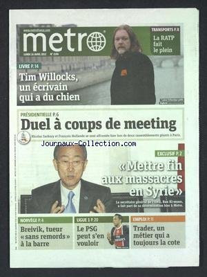 Read PDF METRO [No 2196] du 16/04/2012 - PRESIDENTIELLE - DUEL A COUPS DE MEETING - METTRE FIN AUX MASSACRES EN SYRIE - NORVEGE - BREIVIK TUEUR SANS REMORDS A LA BARRE - TRADER - UN METIER QUI A TOUJOURS LA COTE - TIM WILLOCKS - UN ECRIVAIN QUI A DU CHIEN - LES SPORTS - FOOT Online